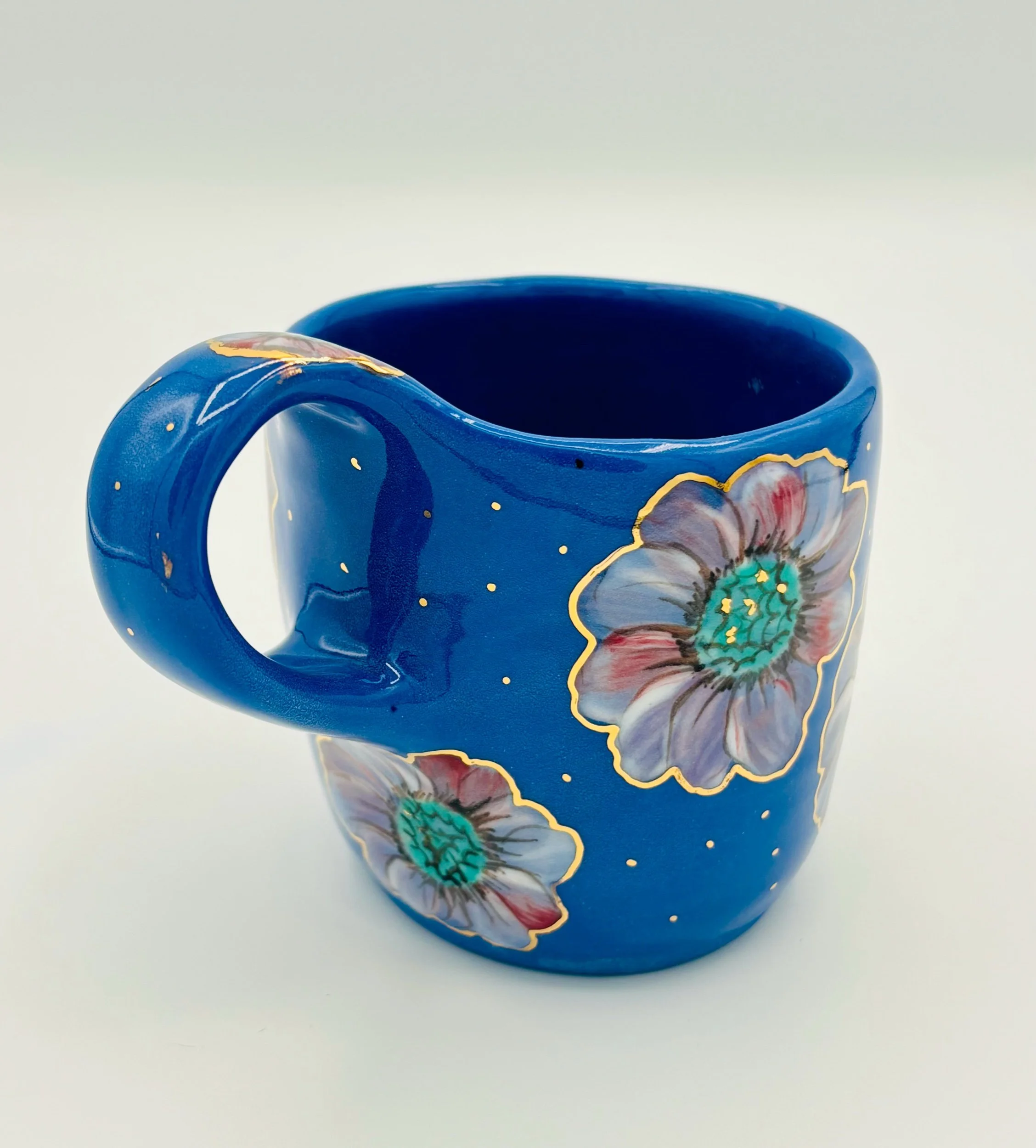 This Golden Bee Cup is wheel-thrown from fine porcelain clay and finished in a soft turquoise glaze. Hand-painted floral motifs in warm amber tones surround the cup, while a delicate bee rendered in 22-karat gold adds a luminous, symbolic accent. Thoughtfully balanced in form and color, this piece brings a sense of joy and craftsmanship to everyday tea or coffee rituals. Each cup is individually made and painted, making it truly one of a kind.