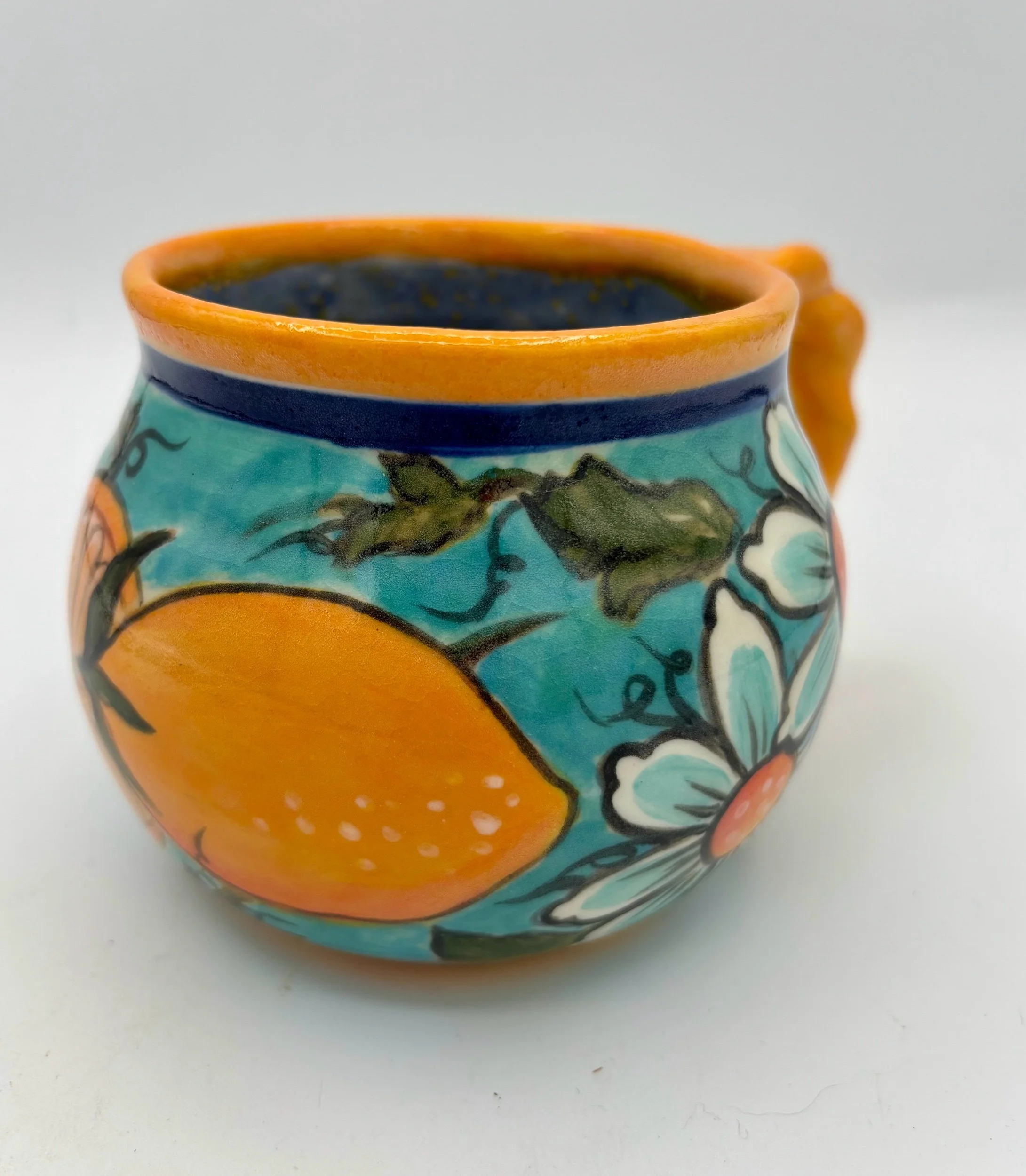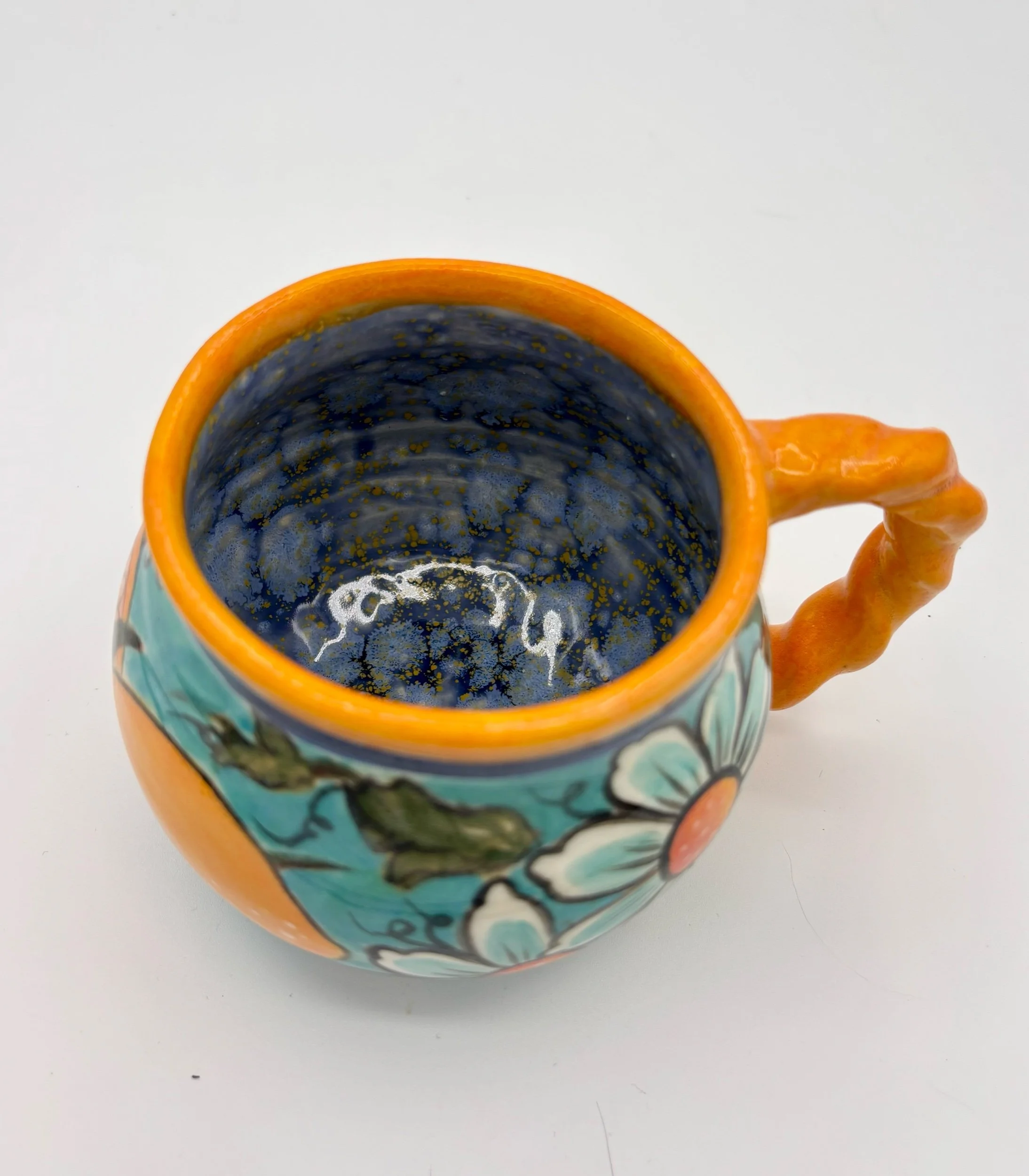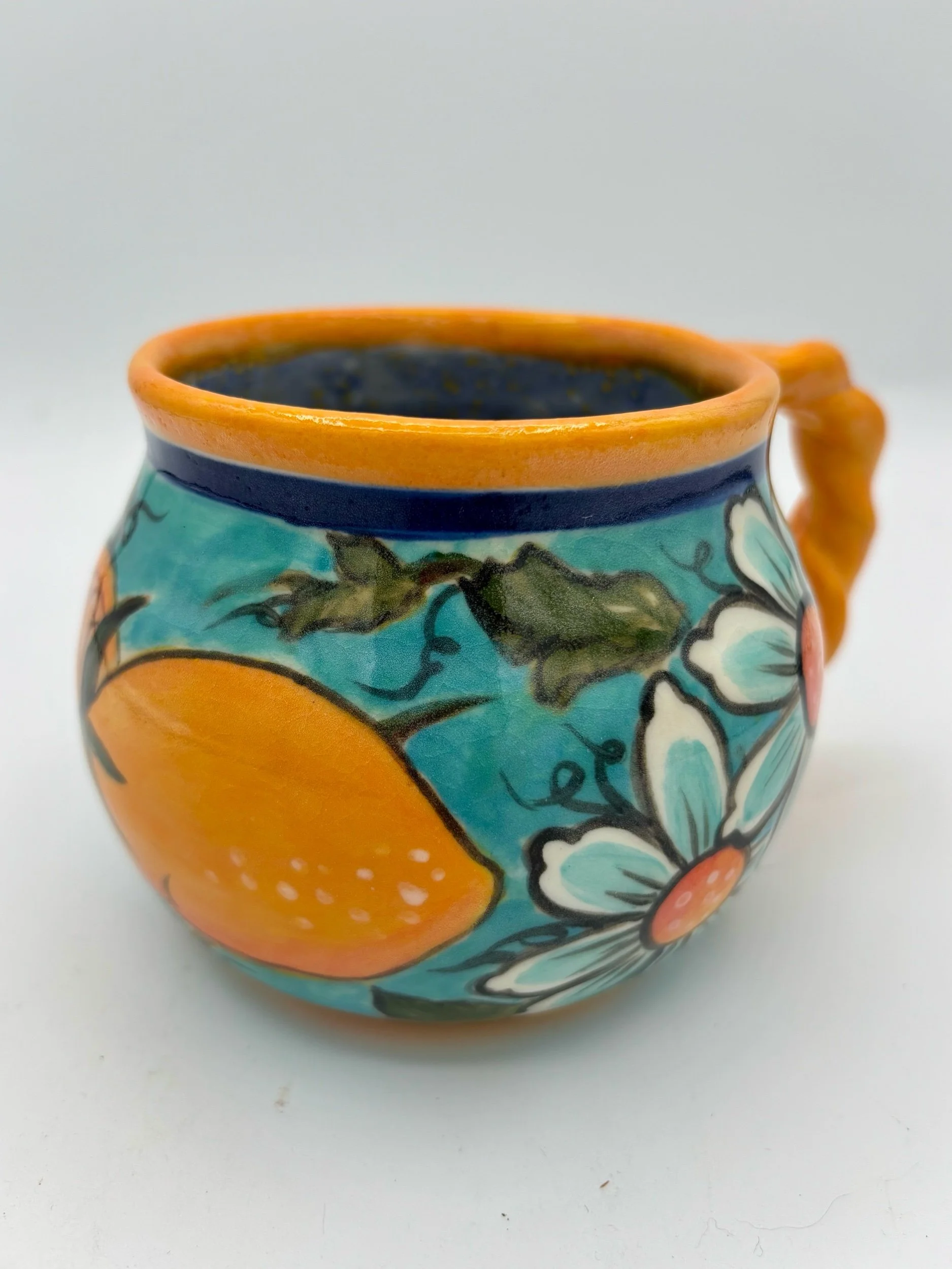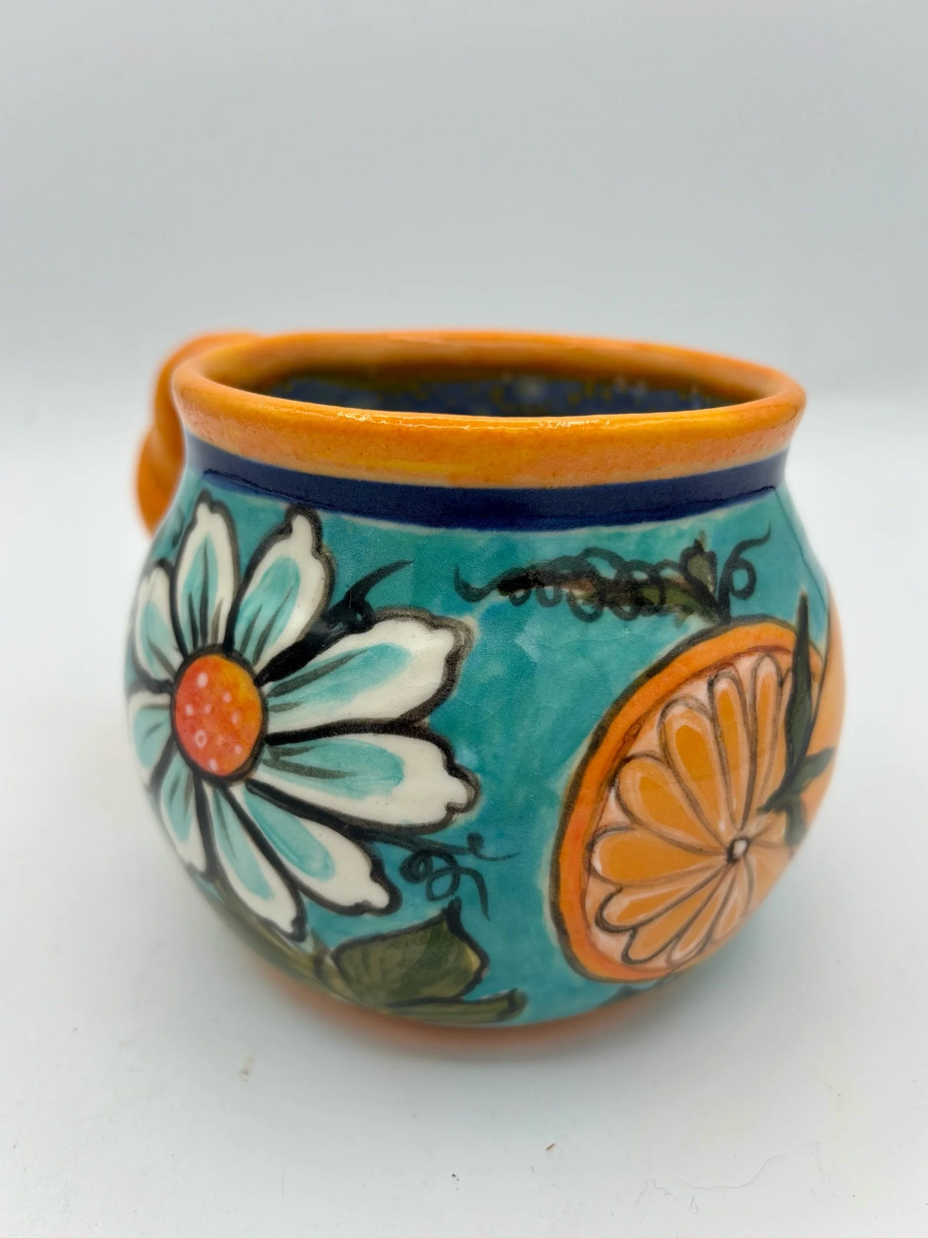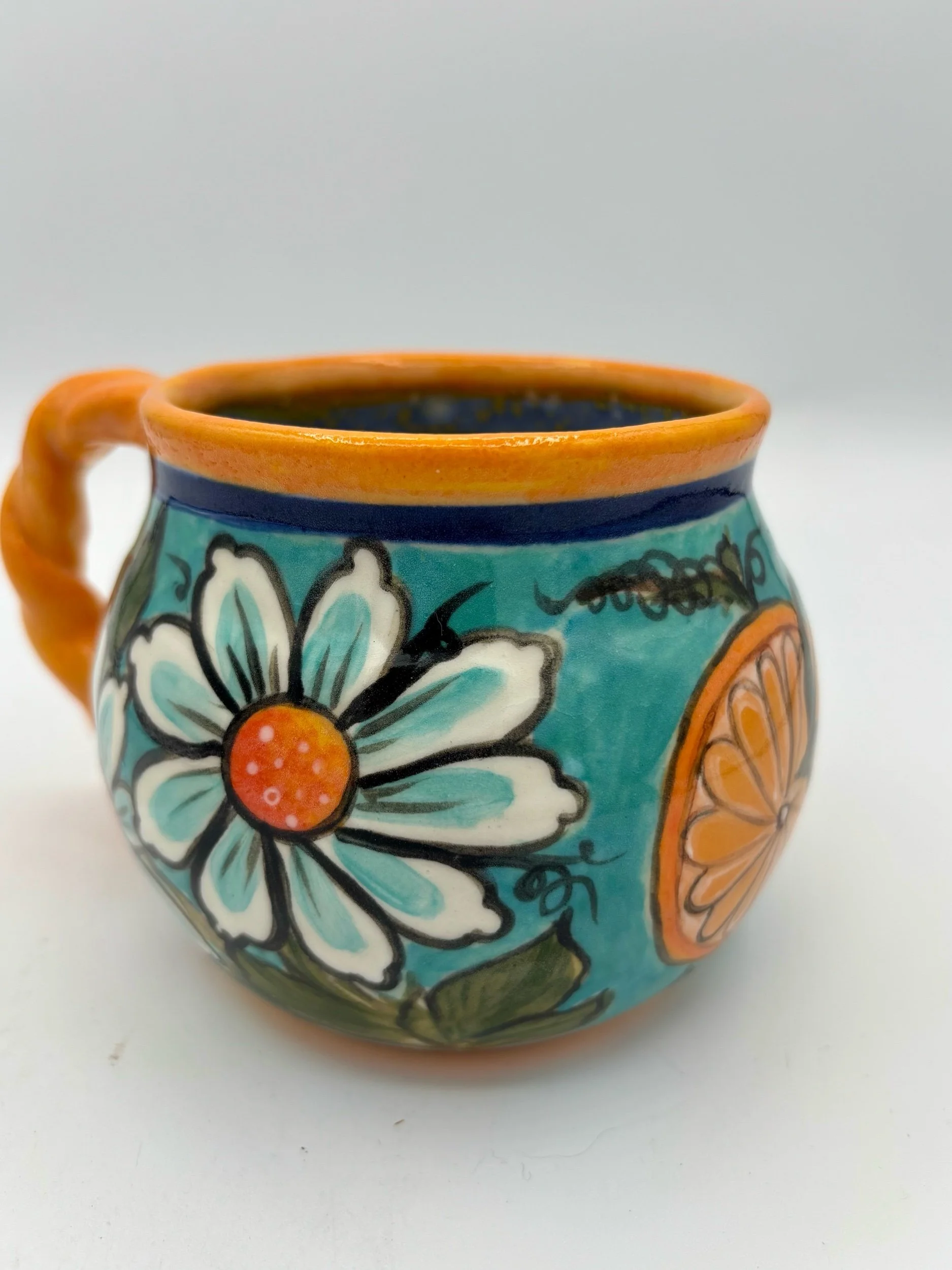 This cheerful handmade ceramic mug was thrown on the pottery wheel and carefully hand-painted with delicate daisies and a bright citrus slice on a vibrant turquoise background. The warm yellow rim and twisted handle add a playful, sunny character to the piece. Each detail is painted by hand, giving the mug a lively and joyful feeling.